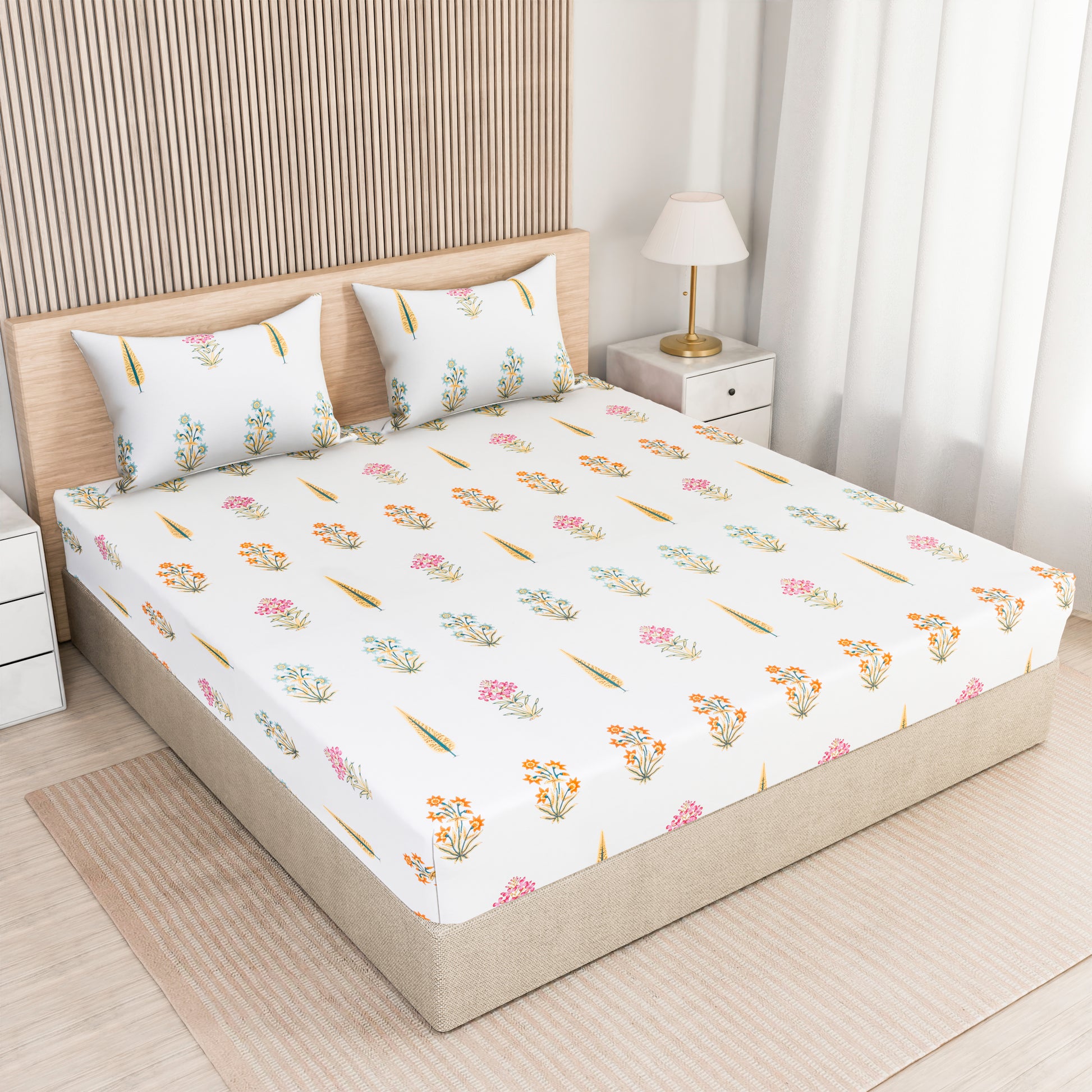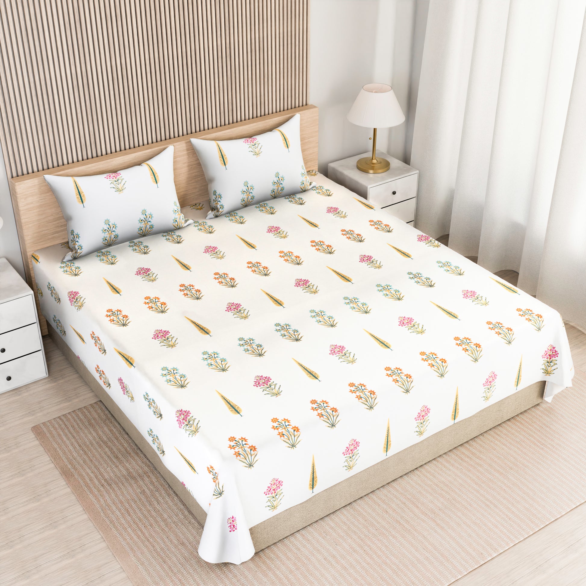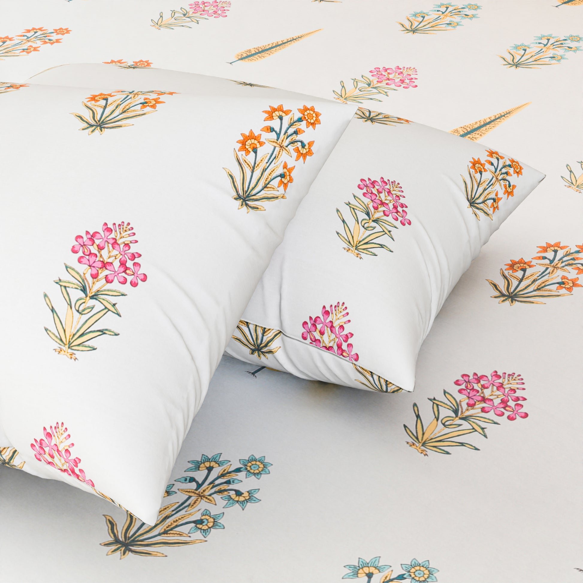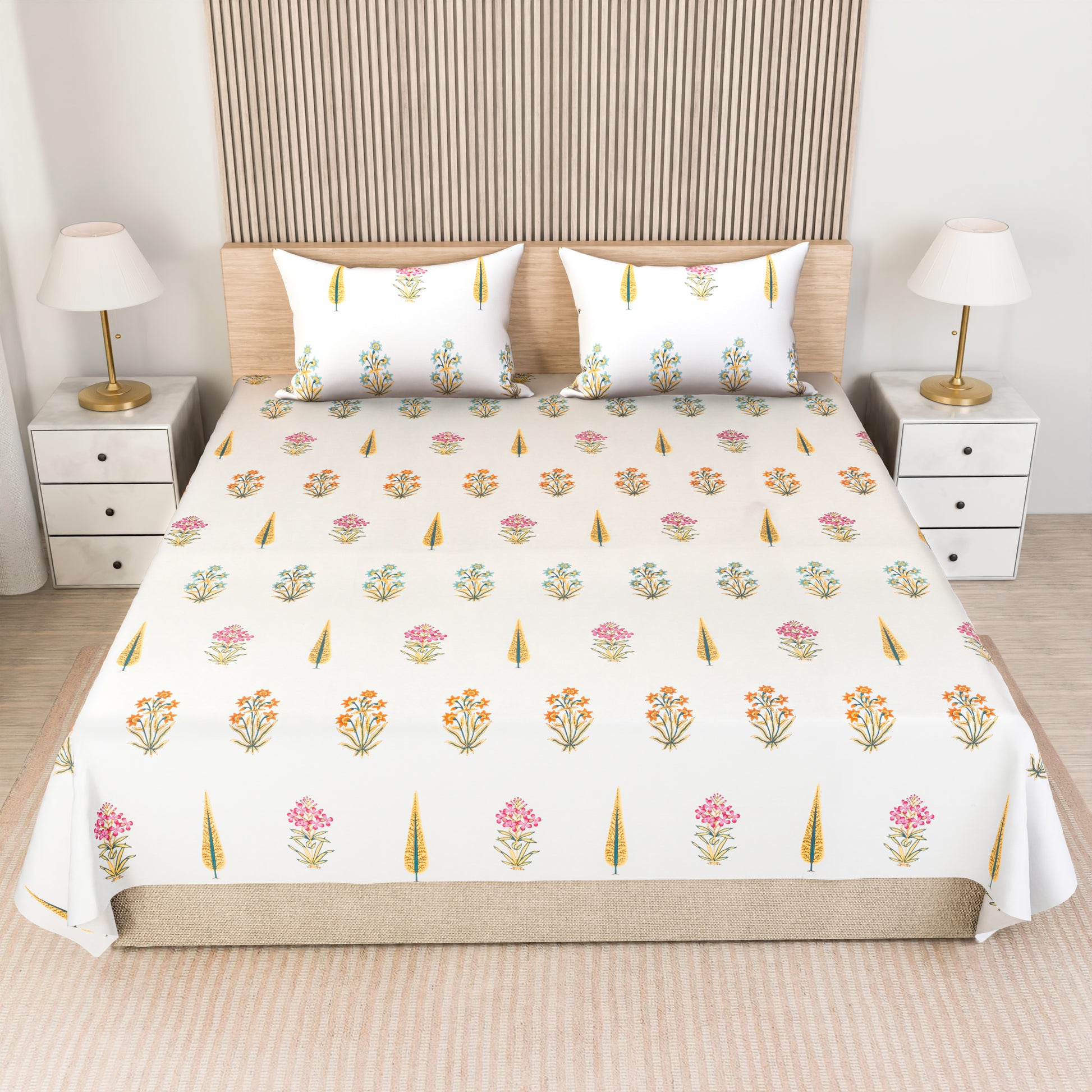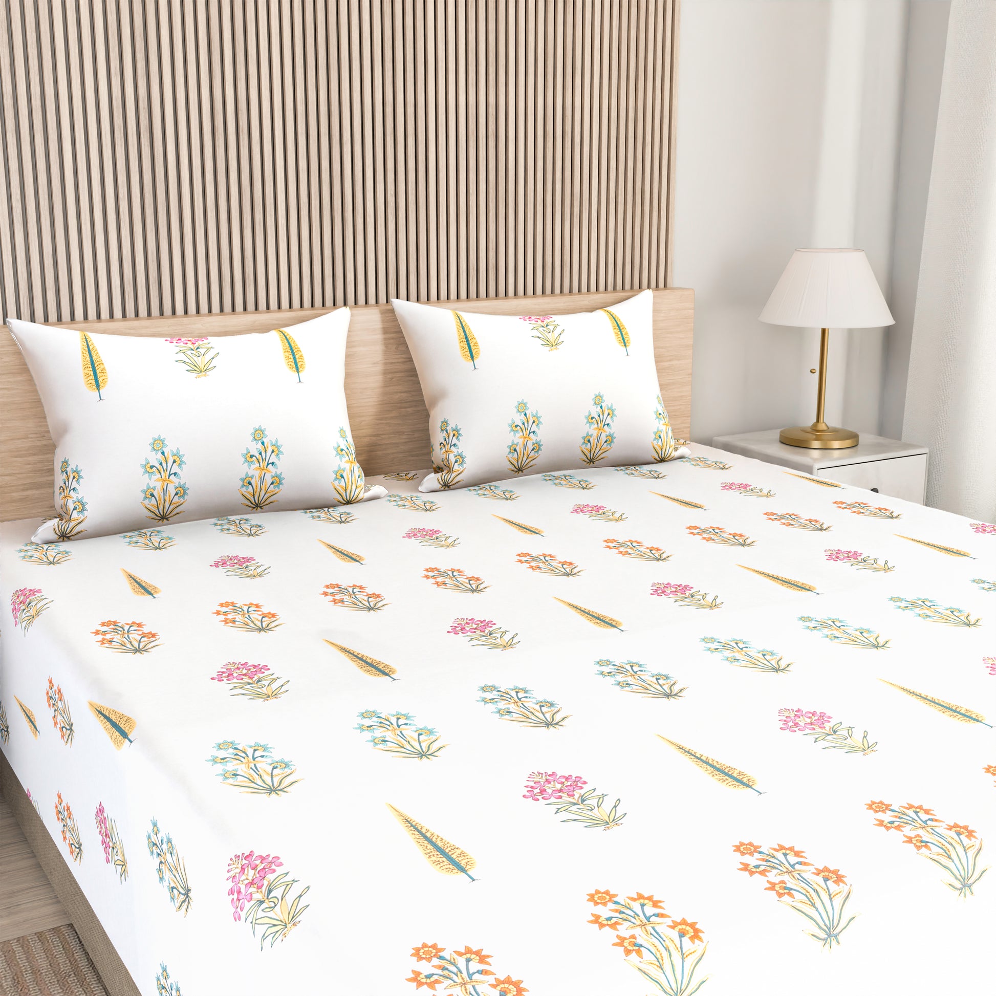 Experience the elegance of the AMBER FLORA king-size bedsheet, measuring 108" by 108". Crafted with a 300 thread count, it offers a smooth, durable texture. The rich, colorful handblock printed motifs stand out beautifully on a pristine white base, adding a sophisticated charm to your bedroom decor. This bedsheet combines traditional craftsmanship with modern quality for a luxurious feel and lasting appeal.